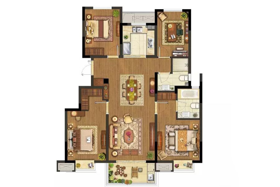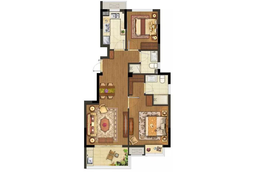 各个空间户型方正,后期空间利用率高;整个空间全明通透,采光良好,同时利于居住空间通风;从卧室进卫生间需要穿过餐厅或客厅;卧室门朝向客厅或餐厅;各个功能区的尺寸比例规范,布局合理,能很好地满足日常功能需求,整体空间开阔,采光充足,居住舒适度好;公摊高于15%且低于25%,符合住宅公摊正常范围。