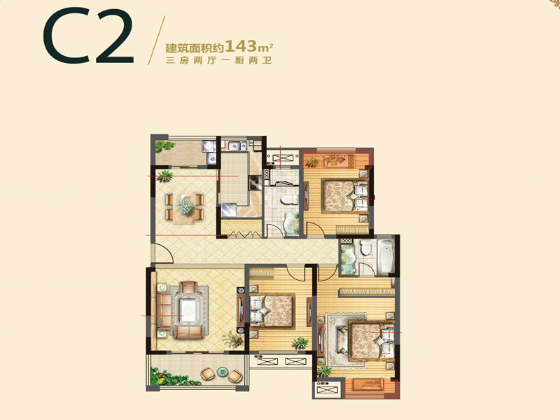 各个空间户型方正,后期空间利用率高;全明户型,各部分空间均有窗,可保证整体空间采光和通风,居住舒适度好;卧室进卫生间需要穿过餐厅或客厅;客厅、卧室、卫生间和厨房等主要功能间的尺寸以及比例适中,有利于采光和通风,居住起来舒适、方便;